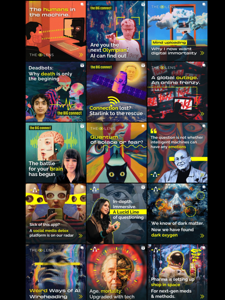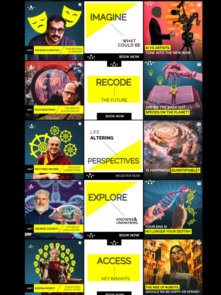 The first two images show our feed and its appearance when promoting our regular content. The next two images showcase the campaign before the main conference, where we promote our speakers and their field of work through eye-grabbing visuals and compelling content.